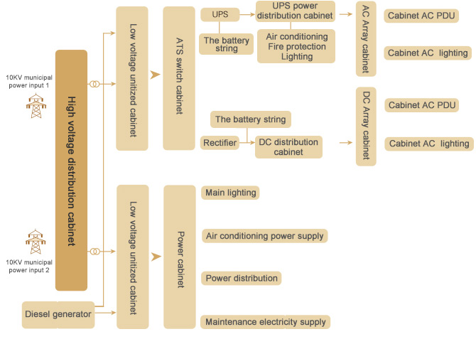 There is a complete distribution system from high voltage distribution unit to the PDU of the terminal cabinet , which is variant according to the size of the data machine room.